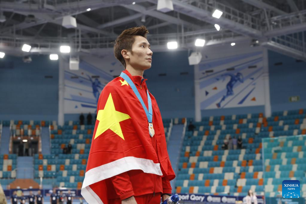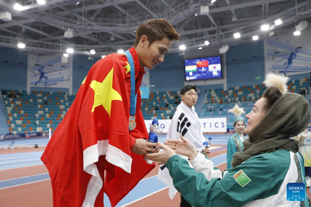Gold medalist Fang Yaoqing of China poses for photos during the awarding ceremony of men's triple jump at the 10th Asian Indoor Athletics Championships in Astana, Kazakhstan, on Feb. 11, 2023. (Photo by Kalizhan Ospanov/Xinhua)