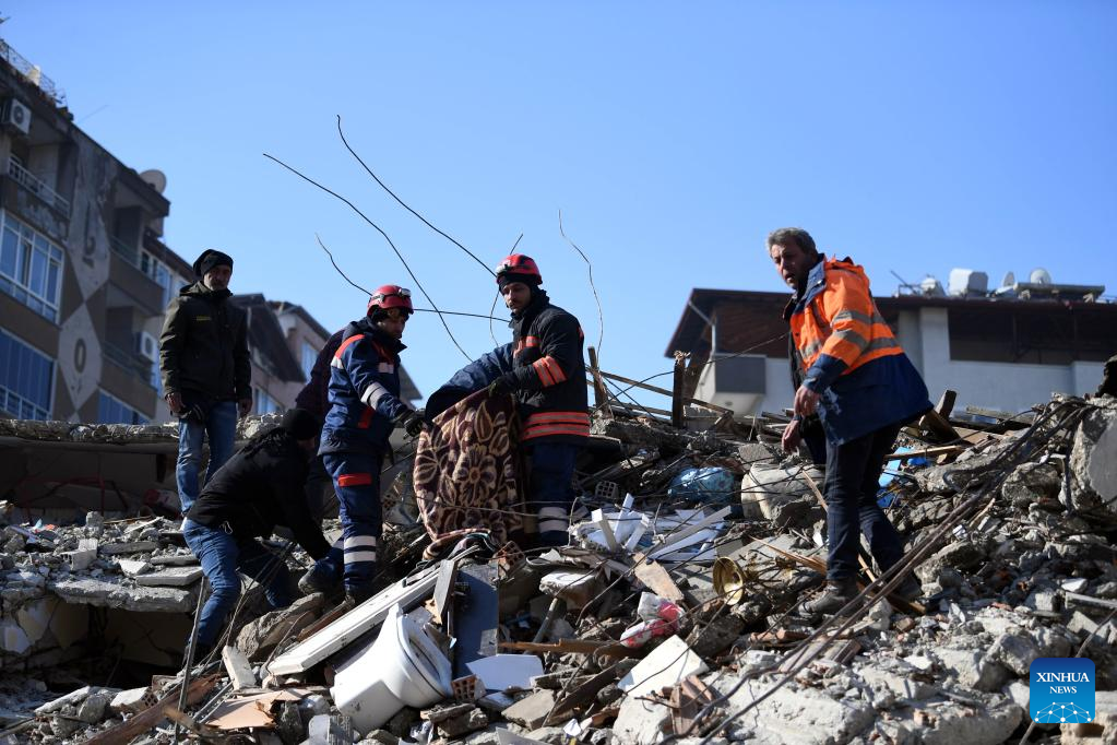 Rescue teams including Chinese rescuers carry out rescue operation on earthquake debris in Antakya in the southern province of Hatay, Trkiye, Feb. 11, 2023. (Xinhua/Shadati)