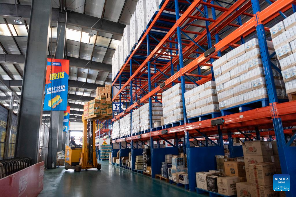 An employee carries goods at the intelligent warehouse and logistics center of Heihe cross-border e-commerce industrial park in the Heihe Area of China (Heilongjiang) Pilot Free Trade Zone in northeast China's Heilongjiang Province, Feb. 11, 2023. Recently, enterprises in the Heihe Area of China (Heilongjiang) Pilot Free Trade Zone have been busy with production to meet the orders and to make a good start in the first quarter of 2023. (Xinhua/Xie Jianfei)