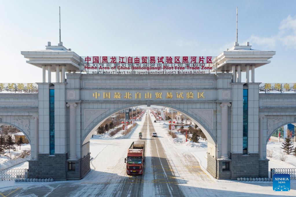 This aerial photo taken on Feb. 11, 2023 shows the gate of the Heihe Area of China (Heilongjiang) Pilot Free Trade Zone in northeast China's Heilongjiang Province. Recently, enterprises in the Heihe Area of China (Heilongjiang) Pilot Free Trade Zone have been busy with production to meet the orders and to make a good start in the first quarter of 2023. (Xinhua/Xie Jianfei)