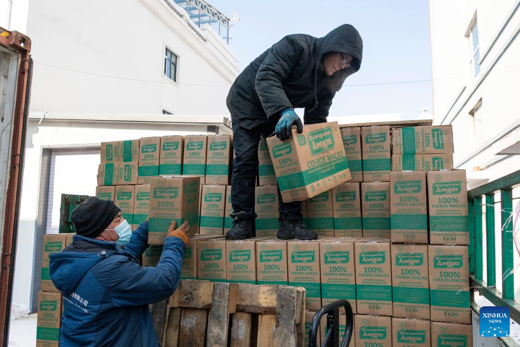 Employees carry imported goods in the Heihe Area of China (Heilongjiang) Pilot Free Trade Zone in northeast China's Heilongjiang Province, Feb. 11, 2023. Recently, enterprises in the Heihe Area of China (Heilongjiang) Pilot Free Trade Zone have been busy with production to meet the orders and to make a good start in the first quarter of 2023. (Xinhua/Xie Jianfei)