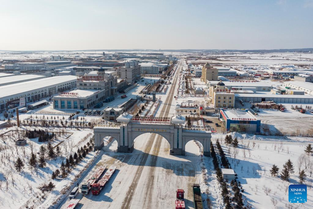 This aerial photo taken on Feb. 11, 2023 shows part of the Heihe Area of China (Heilongjiang) Pilot Free Trade Zone in northeast China's Heilongjiang Province. Recently, enterprises in the Heihe Area of China (Heilongjiang) Pilot Free Trade Zone have been busy with production to meet the orders and to make a good start in the first quarter of 2023. (Xinhua/Xie Jianfei)