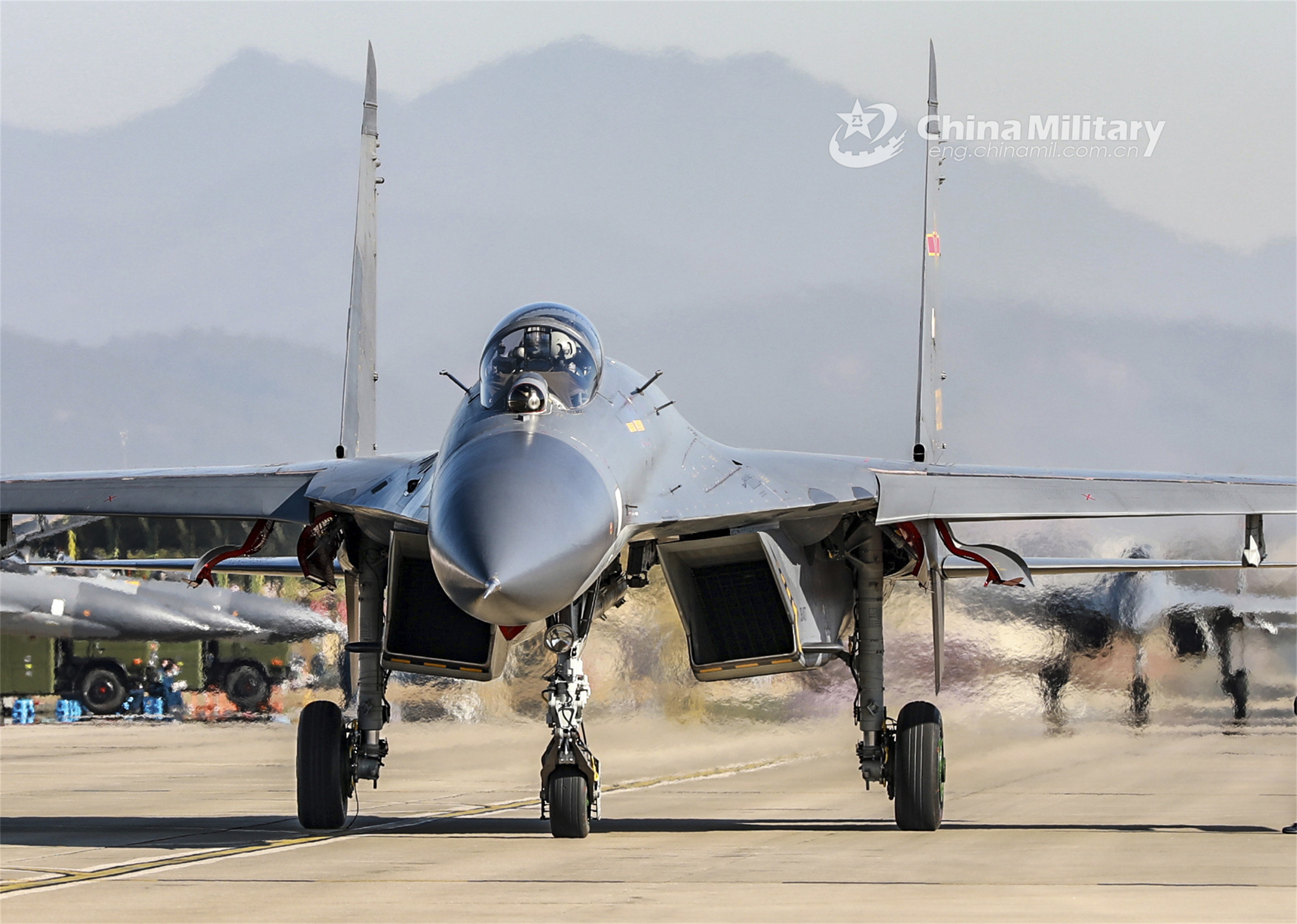 Fighter jets attached to an aviation brigade of the air force under the PLA Eastern Theater Command taxi in close formation on the flightline before takeoff for a round-the-clock flight training exercise in early February, 2023. (eng.chinamil.com.cn/Photo by Fu Gan)