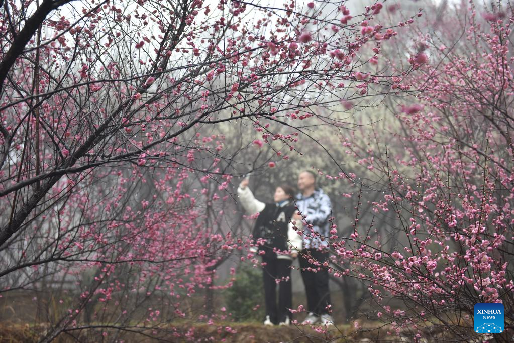 A tourist takes photos of plum blossoms at Gulin park in Nanjing, east China's Jiangsu Province, Feb. 12, 2023. (Photo by Su Yang/Xinhua)