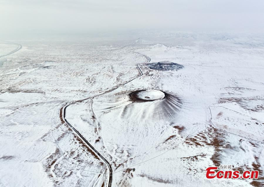 Aerial photo shows volcanoes of Ulanhada volcano cluster covered by snow in Chahar Right Rear Banner of Ulanqab, north China's Inner Mongolia Autonomous Region, Feb. 11, 2023. (Photo: China News Service/Mao Jianjun)