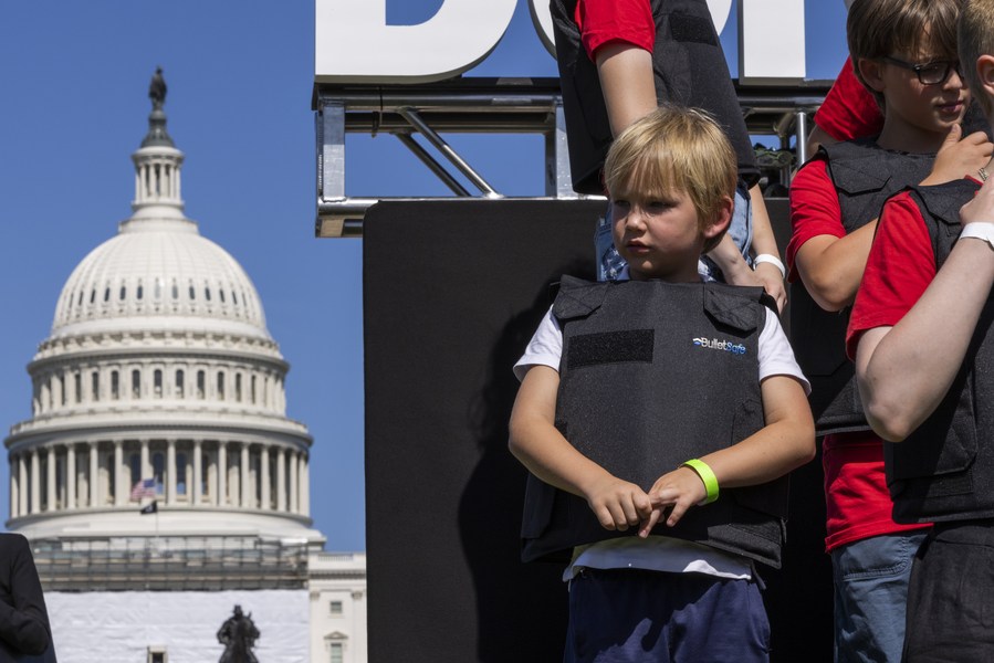 Students wearing bulletproof vests hold a rally near the Capitol Reflecting Pool in Washington, D.C., the United States, June 6, 2022. (Photo by Aaron Schwartz/Xinhua)