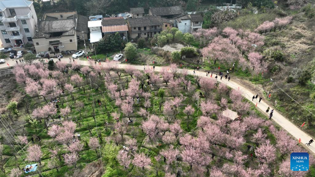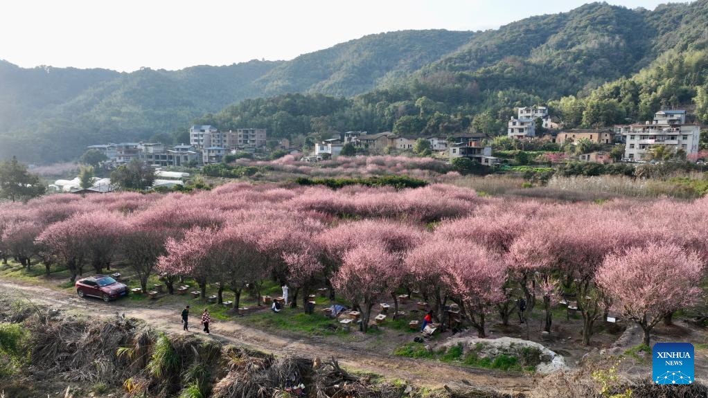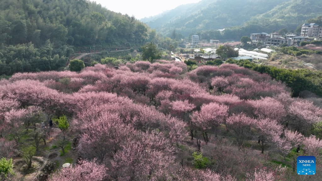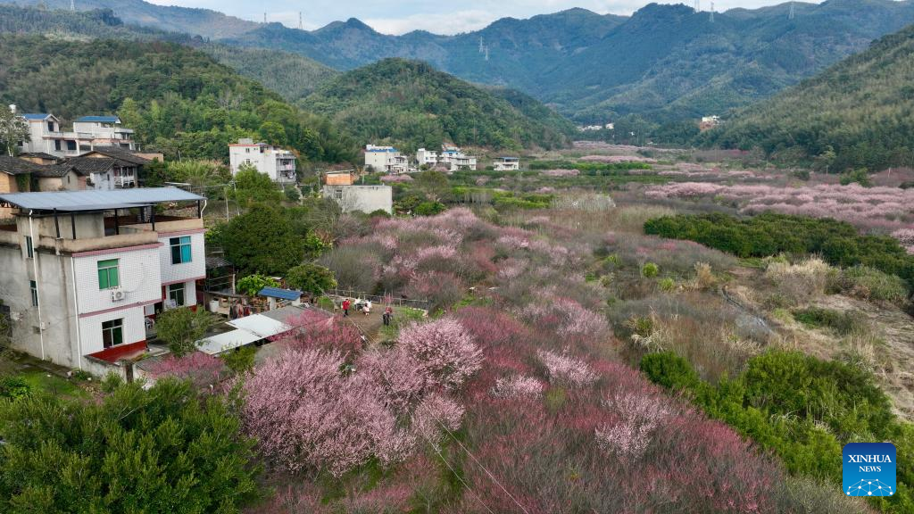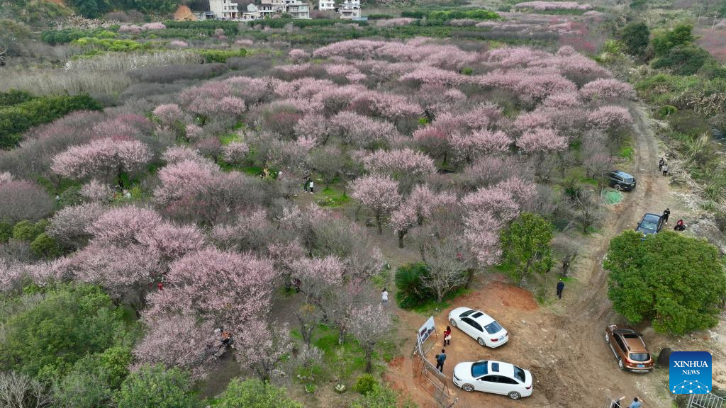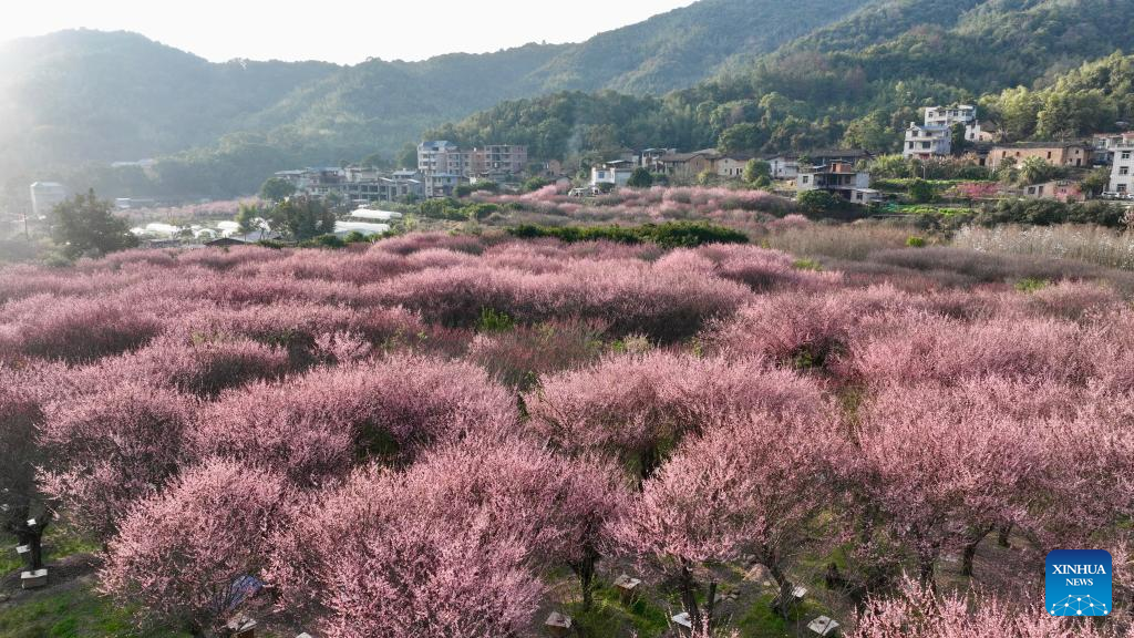 This aerial photo taken on Feb. 12, 2023 shows plum blossoms in the Guxiang hamlet of Guanzhong Village, Minhou County, southeast China's Fujian Province. (Xinhua/Jiang Kehong)