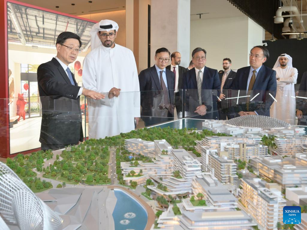 John Lee (1st L), chief executive of the Hong Kong Special Administrative Region (HKSAR), listens to a briefing by a representative of Aldar Properties PJSC in Abu Dhabi, the United Arab Emirates (UAE), on Feb. 7, 2023. (Information Services Department of the Government of the HKSAR/Handout via Xinhua)