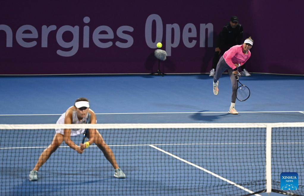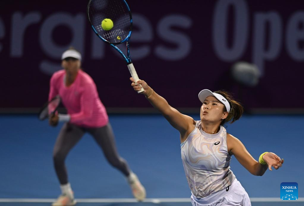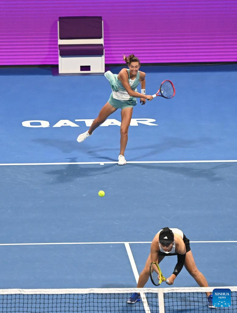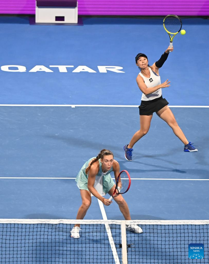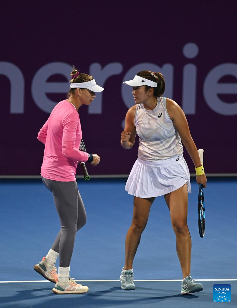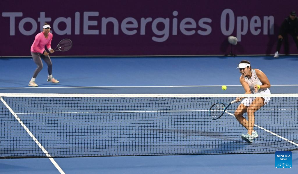 Yang Zhaoxuan (R) of China/ Vera Zvonareva of Russia compete during the doubles round of 16 match against Beatriz Haddad Maia of Brazil/ Marie Bouzkova of the Czech Republic at WTA500 Qatar Open 2023 in Doha, Qatar, Feb. 13, 2023. (Photo by Nikku/Xinhua)