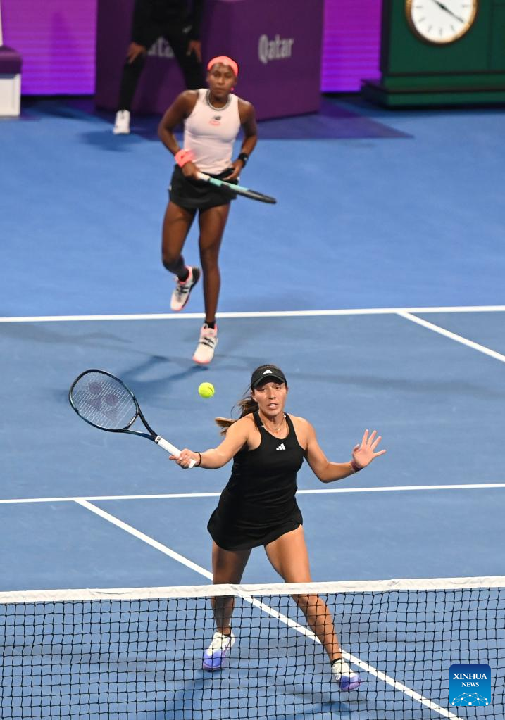 Coco Gauff /Jessica Pegula (R) of the United States compete during the doubles round of 16 match against Xu Yifan of China/ Tereza Mihalikova of Slovakia at WTA500 Qatar Open 2023 in Doha, Qatar, Feb. 13, 2023. (Photo by Nikku/Xinhua)