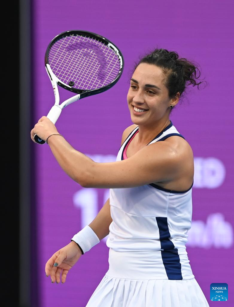 Martina Trevisan of Italy reacts during the singles round of 32 match against Karolna Muchova of the Czech Republic at WTA500 Qatar Open 2023 in Doha, Qatar, Feb. 13, 2023. (Photo by Nikku/Xinhua)