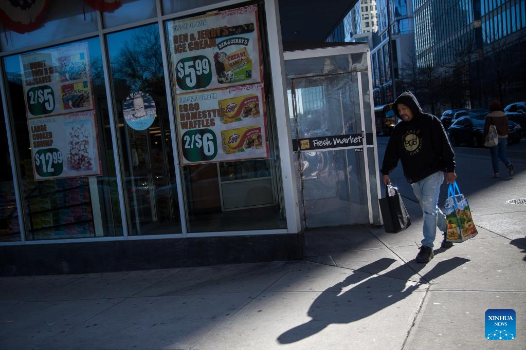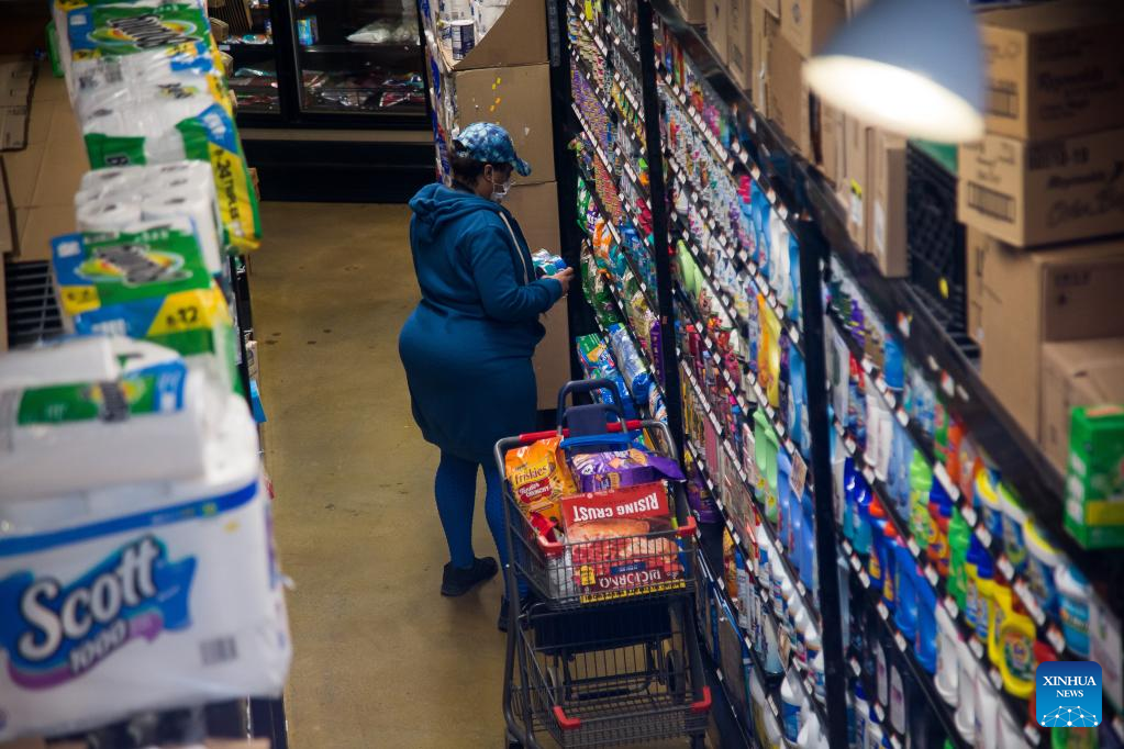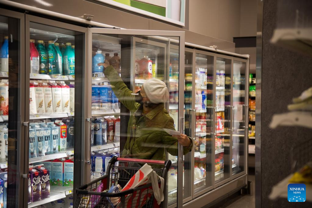 A customer shops at a grocery store in the Brooklyn borough of New York, the United States, on Feb. 14, 2023. The U.S. Labor Department reported Tuesday that U.S. consumer price index, a major gauge of inflation, rose 0.5 percent in January on a monthly basis, the biggest increase in three months and higher than the 0.4 percent expected by economists. The annual rate hit 6.4 percent in January, down slightly from 6.5 percent in December and higher than the market consensus of 6.2 percent. (Photo by Michael Nagle/Xinhua)