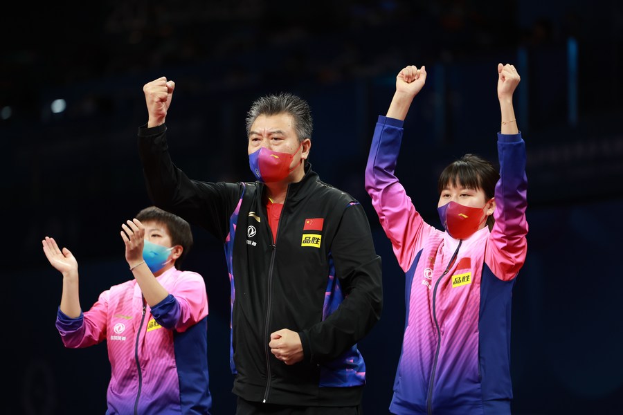 Coach Li Sun (C), players Wang Yidi (L) and Chen Xingtong of China react during the women's teams final at the 2022 ITTF World Team Table Tennis Championships Finals in Chengdu, southwest China's Sichuan Province on Oct. 8, 2022. (Xinhua/Liu Xu)