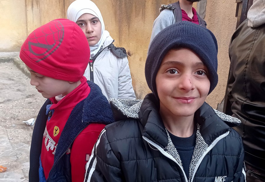 Children are seen at a displacement center in the Salah al-Deen neighborhood in Aleppo, northern Syria, on Feb. 7, 2023. (Str/Xinhua)