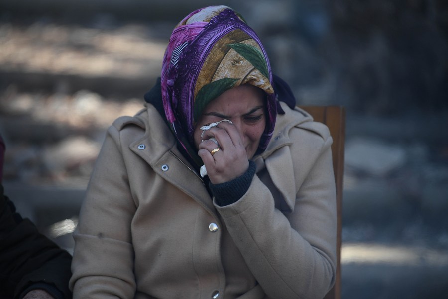 A woman weeps beside earthquake debris in Antakya, Hatay province, Türkiye, on Feb. 11, 2023. (Xinhua/Shadati)