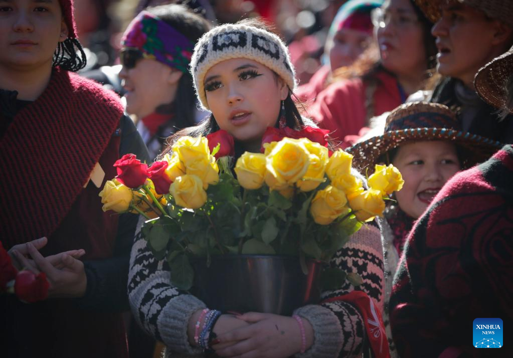 An indigenous girl participates in the Women's Memorial March in Vancouver, British Columbia, Canada, on Feb. 14, 2023. Thousands of people participated in the march to commemorate the missing and murdered indigenous women and girls. (Photo by Liang Sen/Xinhua)