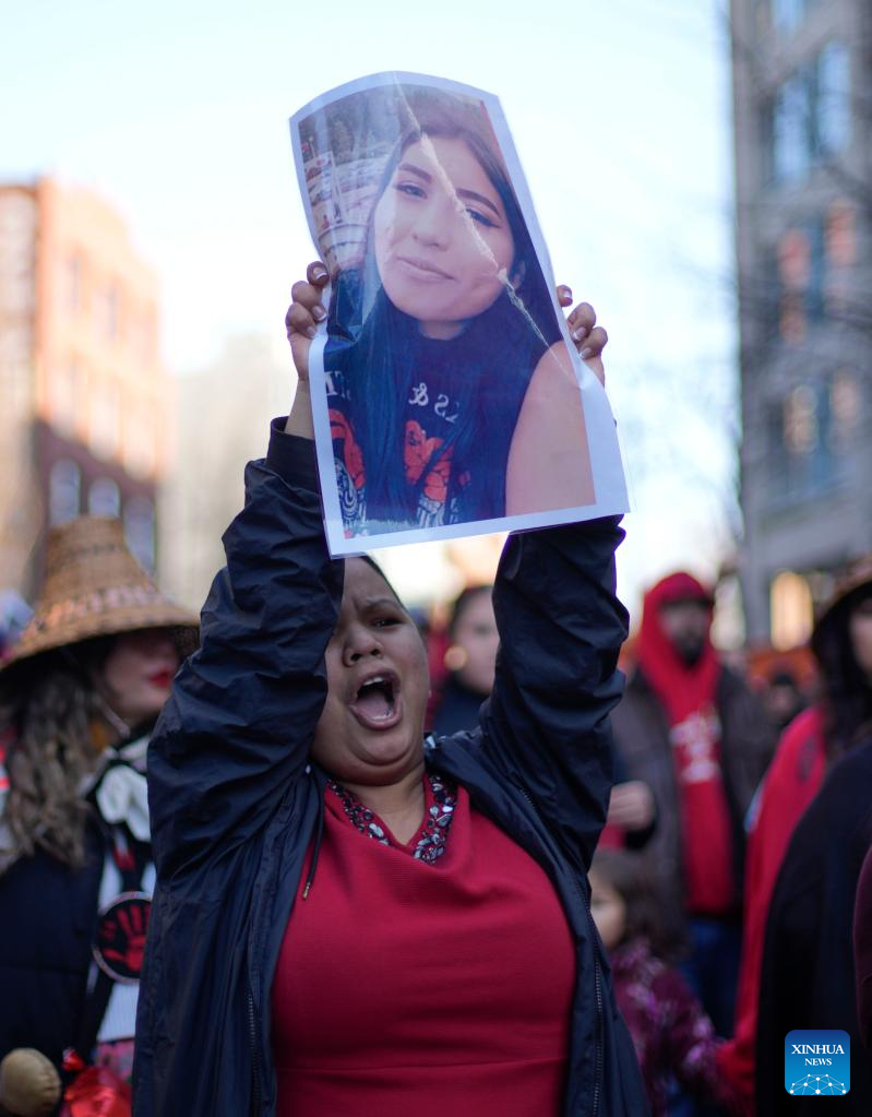 An indigenous woman holding a photo participates in the Women's Memorial March in Vancouver, British Columbia, Canada, on Feb. 14, 2023. Thousands of people participated in the march to commemorate the missing and murdered indigenous women and girls. (Photo by Liang Sen/Xinhua)