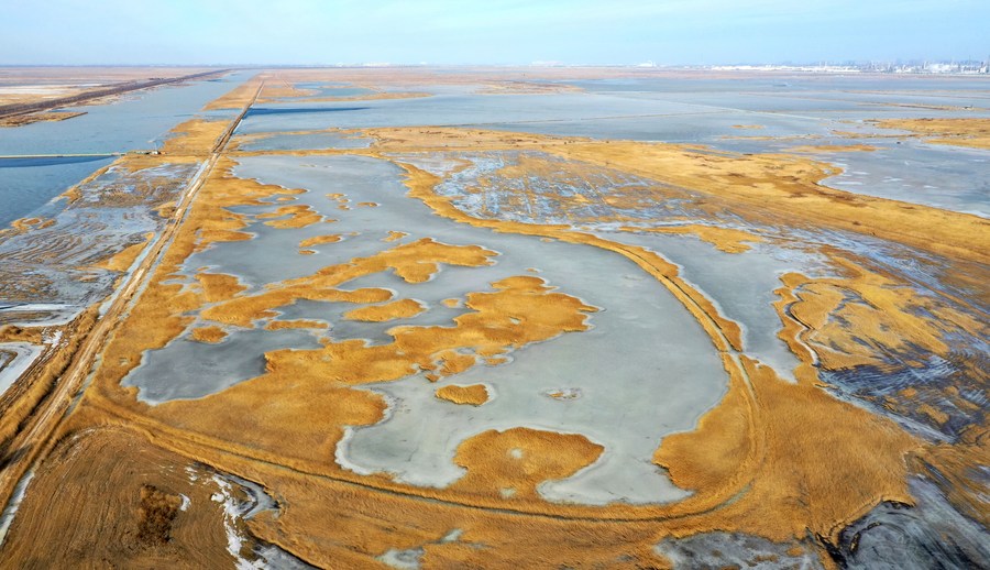 This aerial photo taken on Feb. 1, 2023 shows the view of Beidagang Wetland in north China's Tianjin. (Xinhua/Zhao Zishuo)