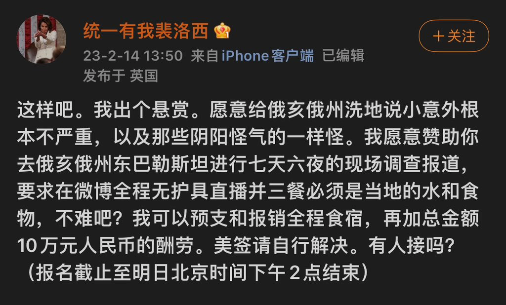 In a demonstration of public concern over the recent Ohio chemical leakage crisis, a wealthy netizen going by the name "Parody Pelosi" on Weibo, China's Twitter-like social media platform, has offered 100,000 RMB to any volunteer who will go to the site and report for 24 hours without protective gear.