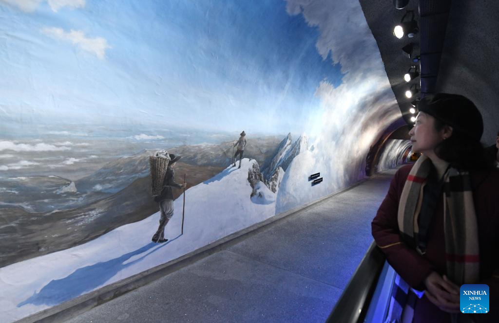 A Chinese tourists views a wall displaying the construction history of the Jungfrau railway at "Jungfraujoch -- Top of Europe," the highest railway station in Europe at the altitude of 3,454 meters above sea level, in Jungfrau, Switzerland. (Xinhua/Lian Yi)