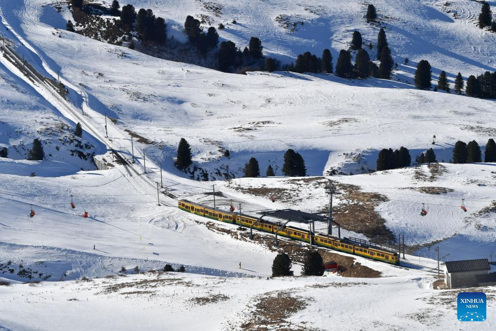 A train runs in the mountains in the Jungfrau region in Switzerland, Feb. 14, 2023. (Xinhua/Lian Yi)