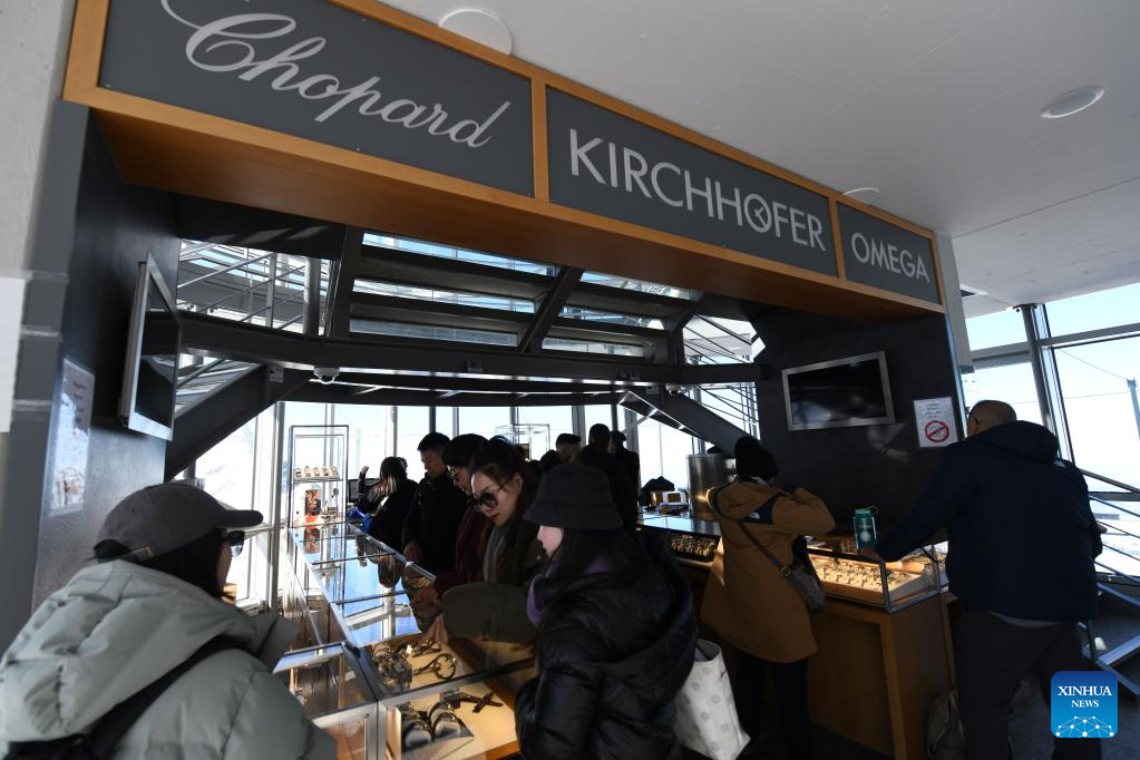Chinese tourists visit a watch store at the altitude of 3,571 meters above sea level on Jungfrau Mountain in Switzerland. (Xinhua/Lian Yi)