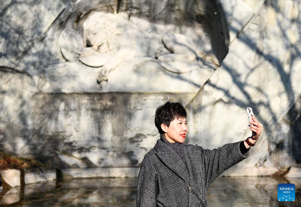 A Chinese tourist takes a selfie in front of the city's landmark Lion Monument in Lucerne, Switzerland, Feb. 13, 2023. (Xinhua/Lian Yi)
