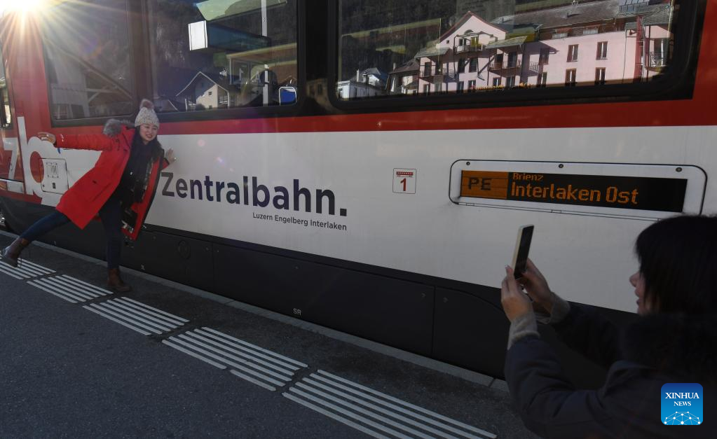 A Chinese tourist poses for a photo with the Zentralbahn from Lucerne to Interlaken during a break in Switzerland, Feb. 14, 2023. (Xinhua/Lian Yi)