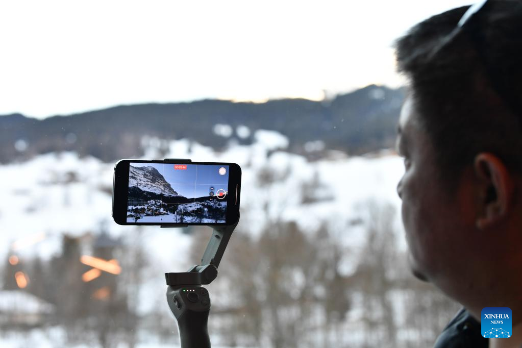 A Chinese tourist shoots a video of the landscape in the Jungfrau region in Switzerland, Feb. 14, 2023. (Xinhua/Lian Yi)