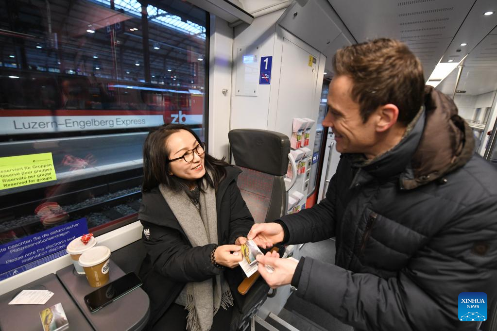 Stefan Pfister of Swiss railway company the Zentralbahn offers a piece of chocolate to a Chinese tourist on the Zentralbahn from Lucerne to Interlaken, Switzerland, Feb. 14, 2023. (Xinhua/Lian Yi)