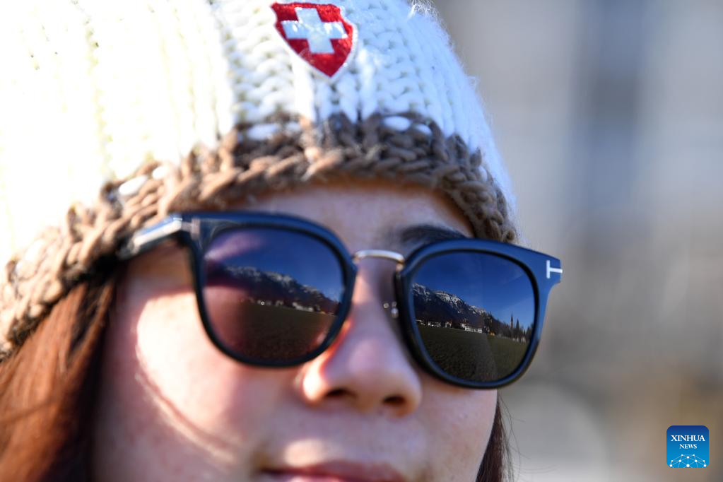 This photo taken on Feb. 14, 2023 shows the snow mountain scenery in the Jungfrau region being reflected on the sunglasses of a Chinese tourist, in Interlaken, Switzerland. (Xinhua/Lian Yi)