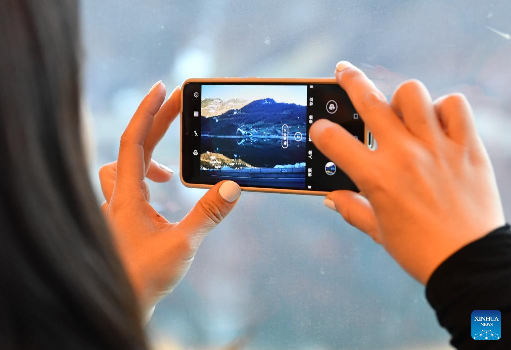A Chinese tourist takes pictures of the scenery out of the window on the Zentralbahn from Lucerne to Interlaken, Switzerland, Feb. 14, 2023. (Xinhua/Lian Yi)