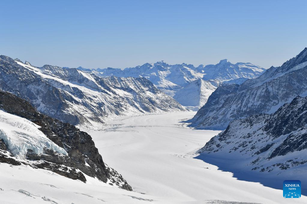This photo taken on Feb. 14, 2023 from Observation Terrace Sphinx on Jungfrau Mountain at the altitude of 3,571 meters above sea level shows the Aletsch glacier in Switzerland. (Xinhua/Lian Yi)