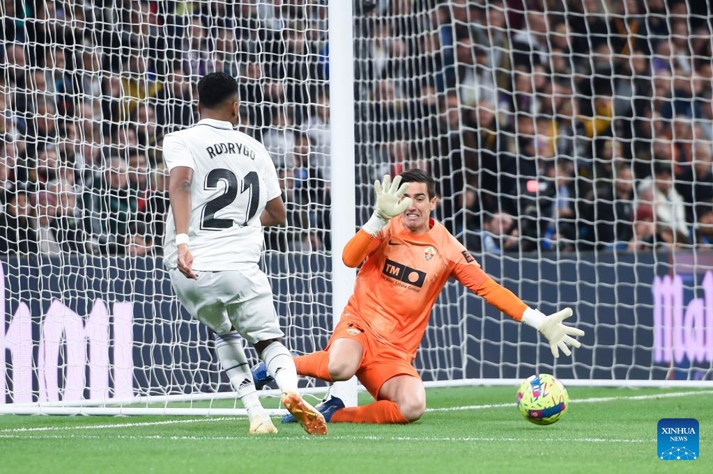 Rodrygo (L) of Real Madrid shoots a goal during a Spanish La Liga football match between Real Madrid and Elche CF in Madrid, Spain, Feb. 15, 2023. (Photo by Gustavo Valiente/Xinhua)