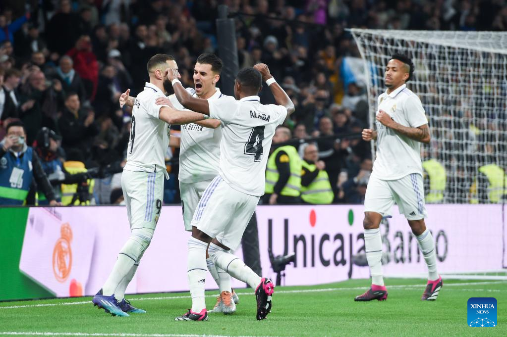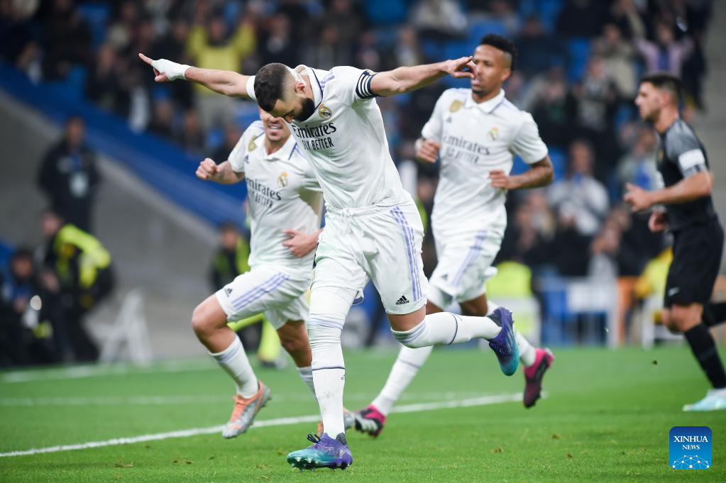 Karim Benzema (Front) of Real Madrid celebrates a goal during a Spanish La Liga football match between Real Madrid and Elche CF in Madrid, Spain, Feb. 15, 2023. (Photo by Gustavo Valiente/Xinhua)