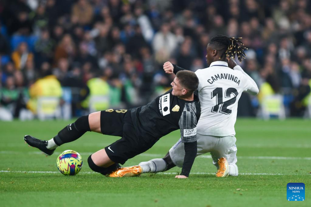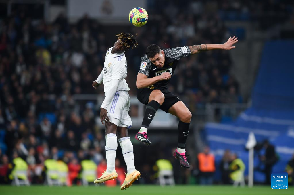 Eduardo Camavinga (R) of Real Madrid vies with Raul Guti of Elche during a Spanish La Liga football match between Real Madrid and Elche CF in Madrid, Spain, Feb. 15, 2023. (Photo by Gustavo Valiente/Xinhua)