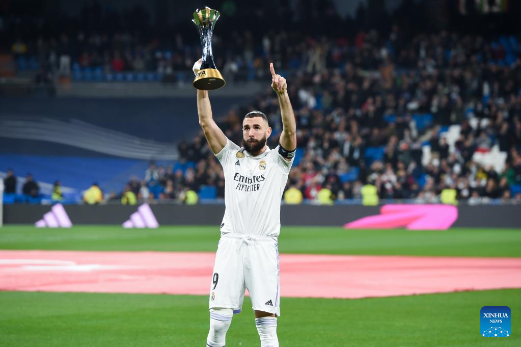 Karim Benzema of Real Madrid shows the trophy of the FIFA Club World Cup to supporters before a Spanish La Liga football match between Real Madrid and Elche CF in Madrid, Spain, Feb. 15, 2023. (Photo by Gustavo Valiente/Xinhua)