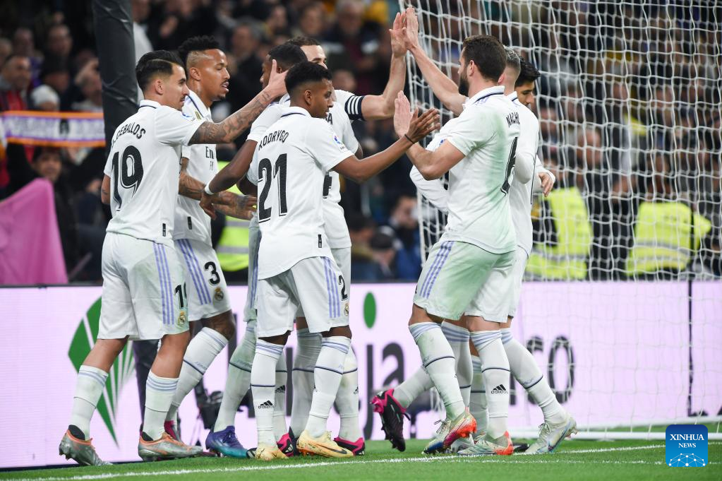 Players of Real Madrid celebrate a goal during a Spanish La Liga football match between Real Madrid and Elche CF in Madrid, Spain, Feb. 15, 2023. (Photo by Gustavo Valiente/Xinhua)