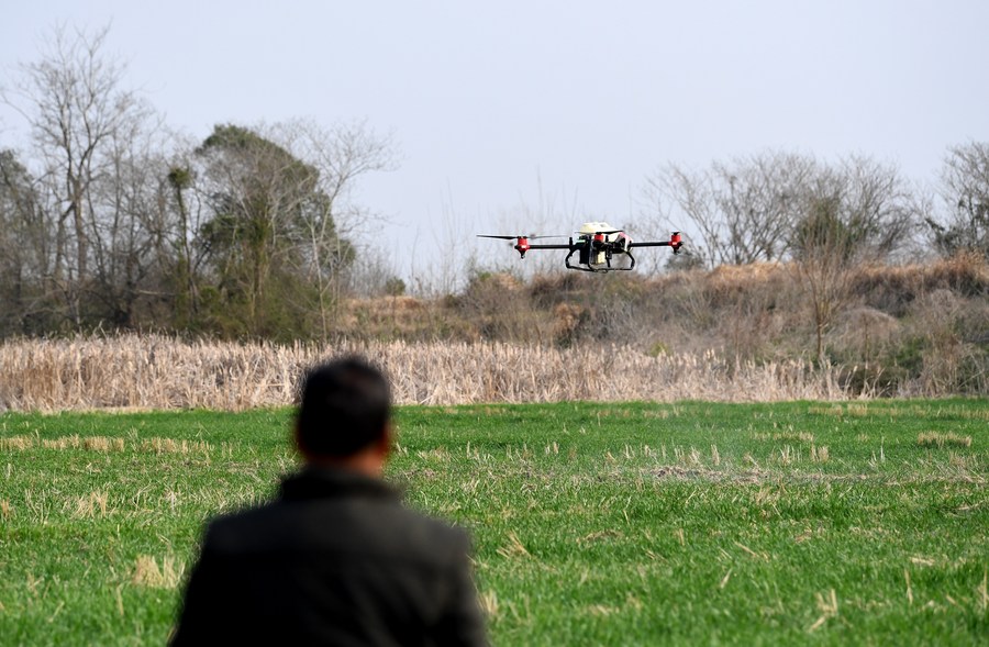 A farmer uses a drone to spray pesticide in the fields in Huagang Town, Feixi County of Hefei, east China's Anhui Province, Feb. 23, 2021. (Xinhua/Liu Junxi)