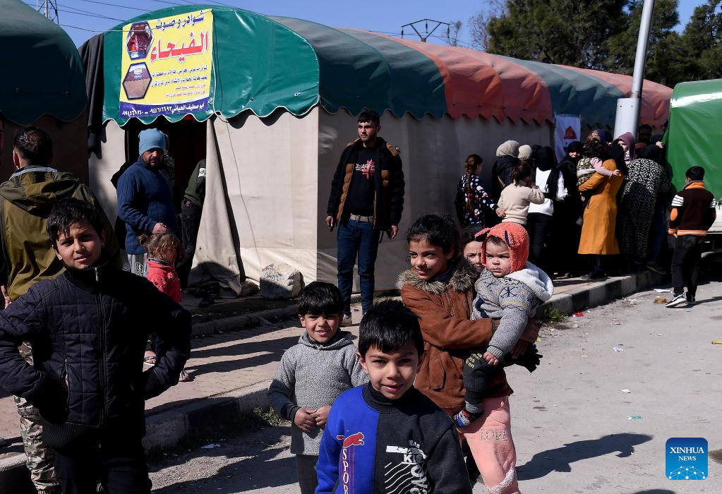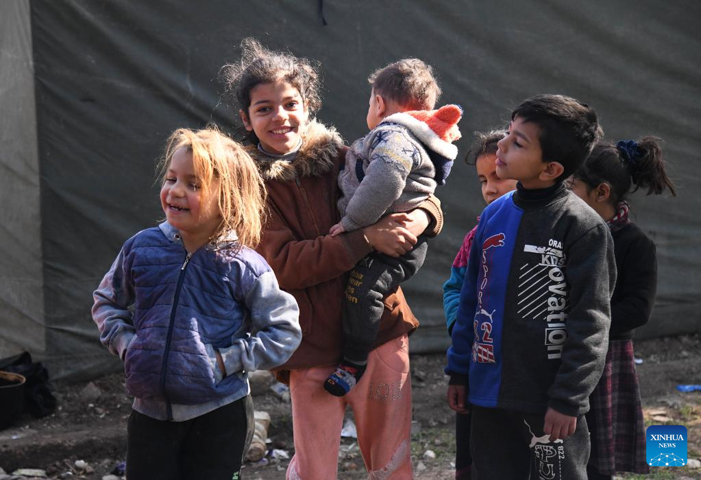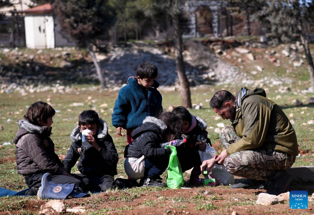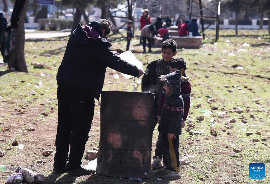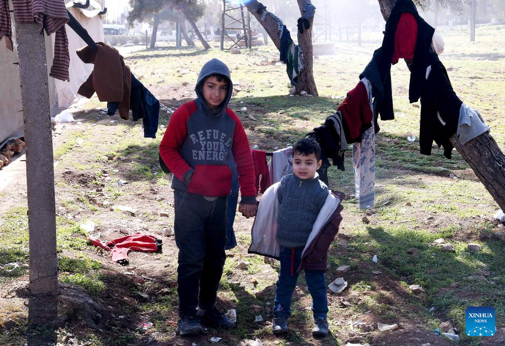 Displaced children are seen at a public park in Aleppo, Syria, on Feb. 16, 2023. The International Federation of Red Cross and Red Crescent Societies (IFRC) on Thursday increased its emergency funding appeals from 200 million Swiss francs (about 216 million U.S. dollars) to 650 million to respond to the rising humanitarian needs in quake-hit Syria and Trkiye. (Str/Xinhua)