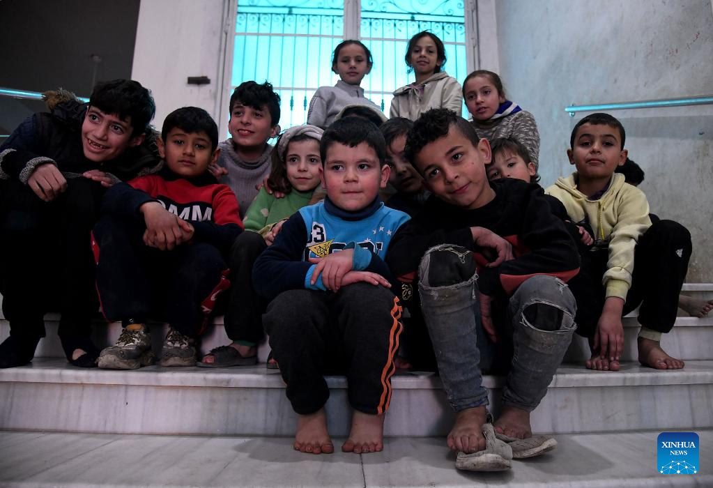 Displaced children are seen at a mosque in Aleppo, Syria, on Feb. 16, 2023. The International Federation of Red Cross and Red Crescent Societies (IFRC) on Thursday increased its emergency funding appeals from 200 million Swiss francs (about 216 million U.S. dollars) to 650 million to respond to the rising humanitarian needs in quake-hit Syria and Trkiye. (Str/Xinhua)