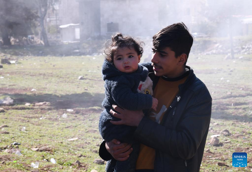 A displaced child is seen at a public park in Aleppo, Syria, on Feb. 16, 2023. The International Federation of Red Cross and Red Crescent Societies (IFRC) on Thursday increased its emergency funding appeals from 200 million Swiss francs (about 216 million U.S. dollars) to 650 million to respond to the rising humanitarian needs in quake-hit Syria and Trkiye. (Str/Xinhua)