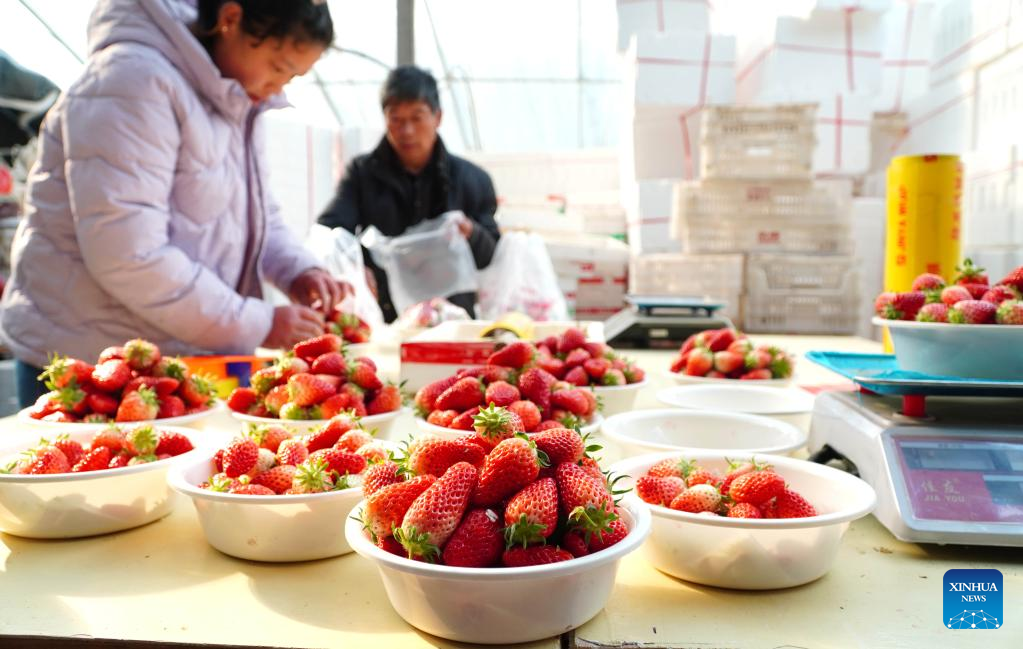Villagers weigh and pack up freshly-picked strawberries in Wuyan Village of Dongping County, east China's Shandong Province, Feb. 16, 2023. Strawberries have entered the harvest season in Dongping County. Villagers are busy picking strawberries to meet market demands. (Xinhua/Xu Suhui)