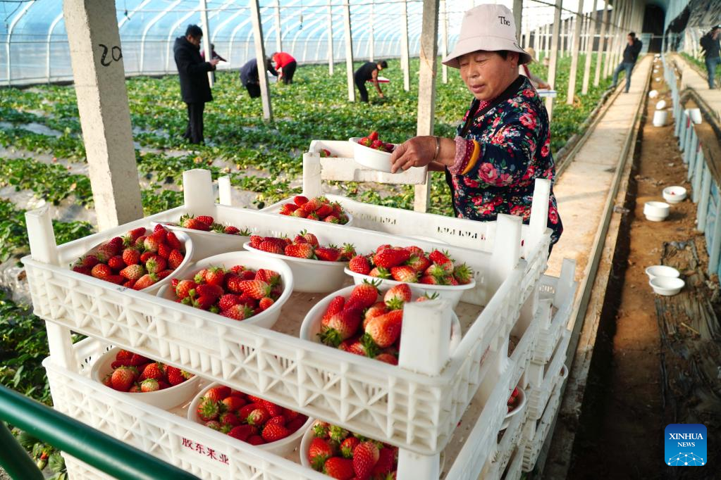 A villager arranges freshly-picked strawberries in a greenhouse in Wuyan Village of Dongping County, east China's Shandong Province, Feb. 16, 2023. Strawberries have entered the harvest season in Dongping County. Villagers are busy picking strawberries to meet market demands. (Xinhua/Xu Suhui)