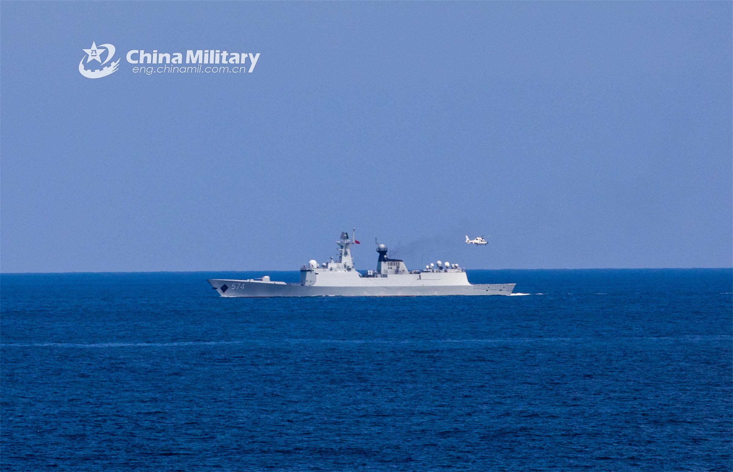 Chinese naval ship Sanya (Hull 574) sails forward with a helicopter on patrol during a joint escort training exercise conducted by China's 42nd and 43rd naval escort taskforces on February 3, 2023. (eng.chinamil.com.cn/Photo by Wang Qing)