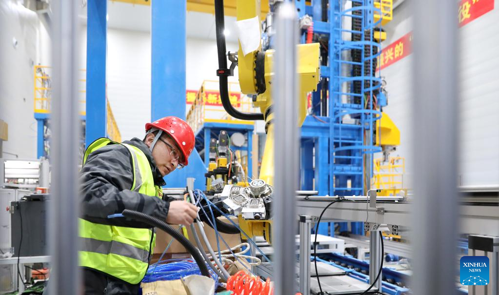 An employee works at the TBEA Shenyang Transformer Group Co., Ltd. in Shenyang, northeast China's Liaoning Province, Feb. 16, 2023. Equipment manufacturing enterprises in Liaoning have been busy with production to meet the orders and to make a good start in the first quarter of 2023. (Xinhua/Yao Jianfeng)