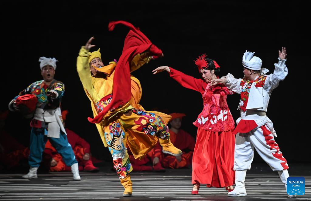 Artists perform in a yangge drama as a part of the first China Intangible Cultural Heritage Protection Annual Meeting in Yulin, northwest China's Shaanxi Province, Feb. 16, 2023. The first China Intangible Cultural Heritage Protection Annual Meeting is held here from Feb. 16 to 20, which features an opening ceremony and a series of performances, exhibitions, and forums. (Photo by Zou Jingyi/Xinhua)