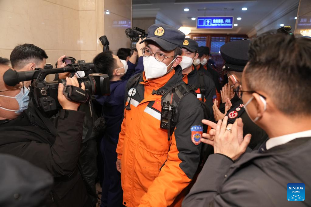 Members of rescue teams dispatched by the Chinese mainland and Hong Kong Special Administrative Region arrive in Beijing, capital of China, Feb. 17, 2023. Rescue teams dispatched by the Chinese mainland and Hong Kong Special Administrative Region returned to Beijing on a chartered plane Friday afternoon, after completing their rescue missions in Trkiye, according to the Ministry of Emergency Management. (Xinhua/Cai Yang)