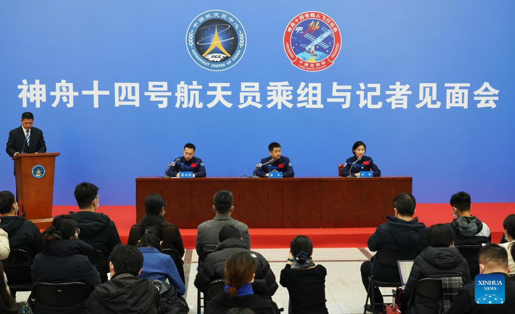 The Shenzhou-14 crew members attend a press conference in Beijing, capital of China, Feb. 17, 2023. The three astronauts of China's Shenzhou-14 crewed mission met with press on Friday, in their first such appearance since returning to Earth in December. (Xinhua/Guo Zhongzheng)