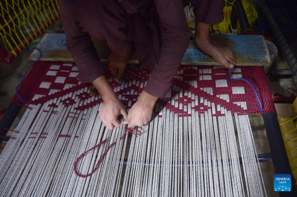 A worker knits a traditional bed locally called "Charpai" in northwest Pakistan's Peshawar on Feb. 17, 2023. (Photo by Saeed Ahmad/Xinhua)